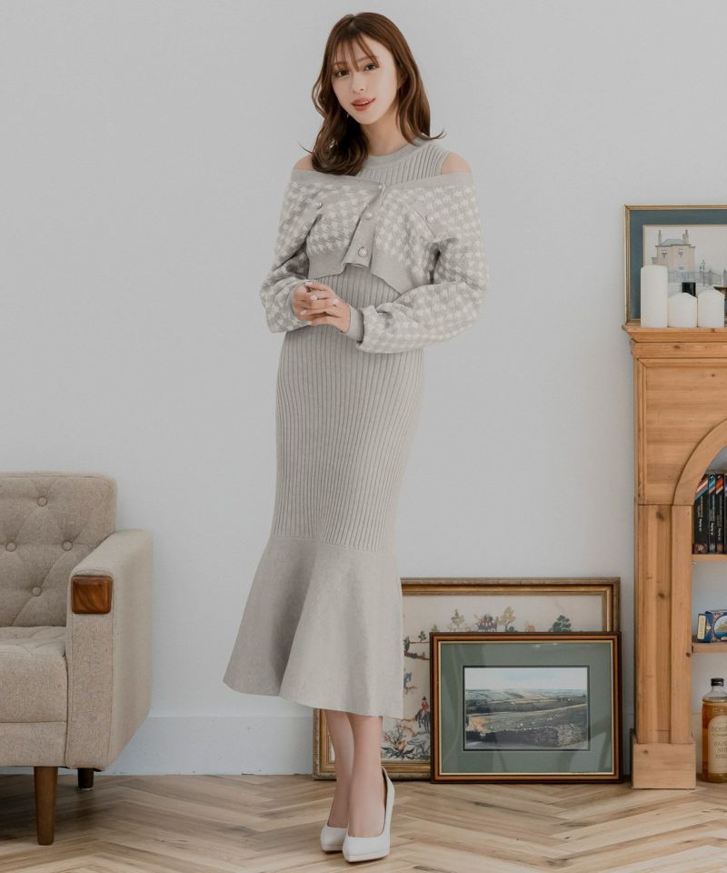 綺麗めコーデ きれいめコーデ 綺麗めファッション きれいめファッション 大人コーデ モテコーデ モテファッション デートコーデ デート服 20代 30代 40代 ワンピース ニットワンピース マーメイドワンピース タイトワンピース ノースリーブ ノースリーブワンピース スリーブレス カーディガン ニット ニットカーディガン ニットカーデ ニットトップス 長袖カーディガン フロントボタン 前ボタン オフショル オフショルダー 肩開き 肩出し 重ね着 リブ りブ編み リブニット 千鳥格子柄 チェック柄 伸縮性 ストレッチ あざとニット あざといニット セットアップ 2ピースセット マシュマロニット もっちりニット 2点セット 骨格ウェーブ ブラック グレー